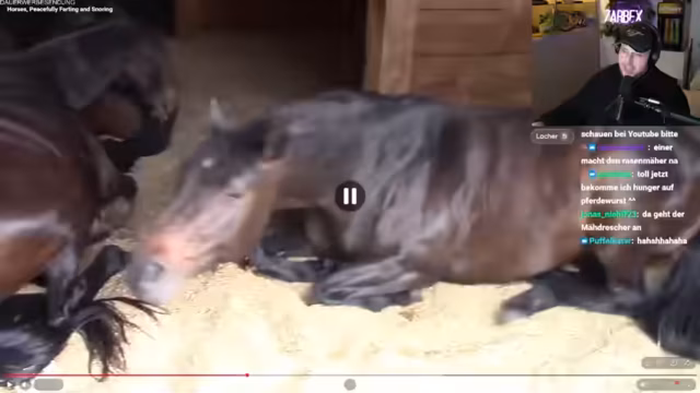 01:58:17Ein gezeigtes Video über schlafende Pferde weckt große Neugier und Faszination. Der Streamer ist erstaunt, dass sich die Tiere hinlegen können, was er bis dahin nicht wusste. Er beschreibt die Szene als friedlich und entspannt, diskutiert aber auch über den Stallgeruch und die Gewohnheiten der Tiere. Dieses Thema führt zu einer allgemeinen Betrachtung über das Verhalten und die Eigenarten verschiedener Tiere.