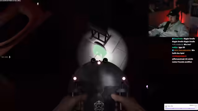 06:41:00Ich glaube, ich habe die beste Waffe. Robin fragt, ob es eine Akku-Pio gibt, was verneint wird. Dienchen bedankt sich für fünf Subs. Ich habe eine Capture-Card. Ich habe theoretisch eine Capture Card am PC dran. Aggo streamt nicht. Die Gruppe muss Pickel zerschießen. Aggo hat die krasseste Waffe, gatekeeped aber, woher er sie hat. Es entsteht Neid unter den Spielern. Ich will die Waffe sehen und sie in die Hand nehmen. Ich biete an, meine Waffe zu zeigen, und fordere Aggo auf, näher zu kommen. Ich frage, ob Aggo die Waffe fallen lassen kann, aber er weiß nicht wie.