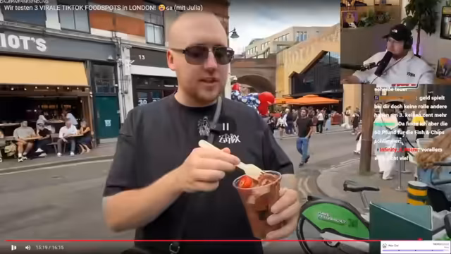 00:59:36Der Streamer berichtet von einer Foodtour in London, beginnend mit einem Besuch der Warner Brothers Studio Tour und dem Harry Potter Kram. Danach wurden virale TikTok-Foodspots in Chinatown erkundet. Besonders hervorgehoben wird die Freundlichkeit der Londoner im Vergleich zu Deutschland. Der erste virale Spot war die Chinatown Bakery, wo es Fischkuchen in Fischform gab. Es folgte ein Besuch bei Delai Taiyaki, wo Nutella-Fische probiert wurden, die wie ein fischförmiger Crepe schmeckten. Ein kleiner Fisch mit Vanillesoße (Custard) wurde ebenfalls getestet. Der Streamer erzählt eine Anekdote aus seiner Schulzeit im Englischunterricht, als er das Wort 'retarded' falsch verwendete. Abschließend wird die Chinatown Bakery empfohlen und der nächste virale Foodspot, Fish and Chips, angekündigt. Der Streamer betont, dass die Vanille in den kleinen Fischen nicht künstlich schmeckte und er normalerweise keinen Vanille-Geschmack mag.