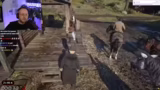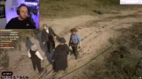 10:58:01Die Gruppe wird plötzlich von Kojoten angegriffen. Es kommt zu einer hektischen Schusswechsel-Situation, bei der Sheriff Taley gerissen wird. Der Streamer schießt auf die Kojoten und rettet Sheriff Taley das Leben. Nach dem Angriff geht die Reise weiter Richtung Strawberry, wobei die Gefahr durch die Kojoten als Präsenz im Hintergrund bleibt.