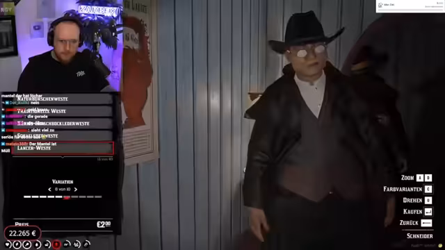 10:29:29Der Streamer kauft neue Kleidung für seine Deputy-Rolle im Schneidergeschäft. Es folgen ausführliche Diskussionen über verschiedene Kleidungsstücke und ihre Eignung, wobei der Streamer schließlich eine schwarze Hose, ein weißes Hemd und einen Mantel wählt. Nachdem er seine neuen Kleidungsstücke angezogen hat, erhält er von Mr. Cockburn weitere Anweisungen und zeigt sich zufrieden mit seinem neuen Look. Dieser Abschnitt zeigt das Engagement für das Rollenspiel.