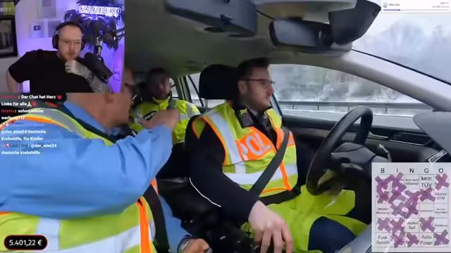 00:08:35Innerhalb weniger Minuten sammeln die Streamer über 1000 Euro an Spenden zusammen. Der Streamer bedankt sich herzlich bei allen Spendern und erwähnt die Seriosität der Aktion, bei der offizielle Spendenbelege per E-Mail versendet werden. Als erstes Event startet ein Bingo-Spiel für den guten Zweck bei einer Autobahnpolizei-Doku. Spezielle Felder wie 'Verfolgung', 'Alkoholtest' oder 'Fahrzeugpapiere' werden gespielt und jedes gefüllte Feld führt zu zusätzlichen Spenden.