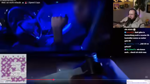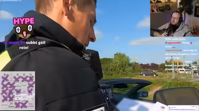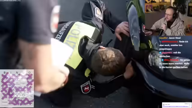 02:33:15Die Polizei in Lüneburg führt eine Verkehrskontrolle bei einem BMW durch, dessen Halter der Vater des Fahrers ist. Der Fahrer wirkt passiv-aggressiv und gibt an, den Grund für die Kontrolle wissen zu wollen. Die Beamten überprüfen die eingetragenen Änderungen am Fahrwerk. Es stellt sich heraus, dass der Fahrer sich mit seinem Auto auskennt, dies aber zunächst nicht zeigen möchte. Es kommt zu einer Diskussion über die Dokumente für die Federn, wobei der Fahrer ABE und Teilegutachten vorlegt, was die Polizisten stutzig macht. Der Fahrer argumentiert, dass er beide Dokumente von H&R erhalten habe. Der Streamer kommentiert die Situation und findet den Polizisten sympathisch, vergleicht ihn aber mit einer Comicfigur. Ben Fire Soul spendet 25 Subs und schaltet einen Bingo-Joker frei.