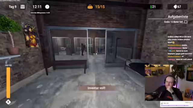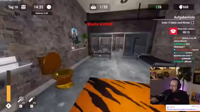 04:08:18Der Streamer widmet sich dem Knast-Simulator, indem er eifrig die Erde abträgt, um ein sauberes Loch zu graben, und dabei seltene Items wie Bronzemünzen und -statuen findet. Eine wichtige Investition ist der Erwerb eines goldenen Klo für 50 Dollar, der als wertvolle und faire Anschaffung im Hardcore-Modus gilt. Ziel ist es, alle Items zu verkaufen, um Geld für Upgrades zu sammeln und die Zelle zu pimpen, während der Chat bei der Orientierung hilft.