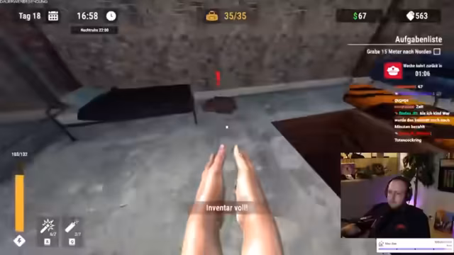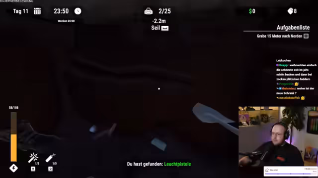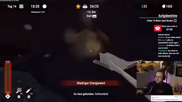 06:41:34Der Streamer kündigt an, dass er am Sonntag einen 12-Stunden-Stream macht und Borderlands für ein Placement anzocken wird. Er weiß noch nicht, ob er spoilern darf, mit wem er es zocken wird, aber es wird eine Kombi, die die Zuschauer aus den Socken haut. Er wird mit Schradin Reactions machen und zwei Stündchen in Borderlands reingehen. Wenn er es geil findet, wird er eventuell auch die Story durchzocken. Er hat die goldene Platte zweimal gefunden und findet, dass es ein geiles Update wäre, wenn man Sachen auf den Tisch stellt zum Verkaufen, dass man die dann vom Tisch nehmen kann oder einzelne Items auswählen kann, die man nicht auf den Tisch packen will. Es gibt hier gar nicht so ein Inventar oder sowas, das ist ein bisschen schade. Oder einfach als Nichtverkauf markieren wäre auch eine Alternative. Er fragt sich, wie viele Sekunden der Leuchtstab hält. Er ist froh, dass er nach der Gamescom nicht krank geworden ist, aber jetzt im Herbst ist er krank. Er hat eine Goldmünze gefunden und fragt sich, ob die Items spawnen, wenn man die hier liegen lässt. Er lässt den goldenen Krug erstmal liegen, weil er nicht weiß, ob er den eventuell nachher noch in der Quest verschachern kann. Er hat gut Meta gemacht und schaufelt alles frei. Er glaubt, das ist die Richtung, in die er nachher graben muss, wo die beiden Felsbrocken sind. Hier ist nachher der Ausgang. Er hat die Zeit im Blick und gräbt hier noch. Er glaubt, das hier ist der Weg, wo er nachher längst muss. Das ist Norden.