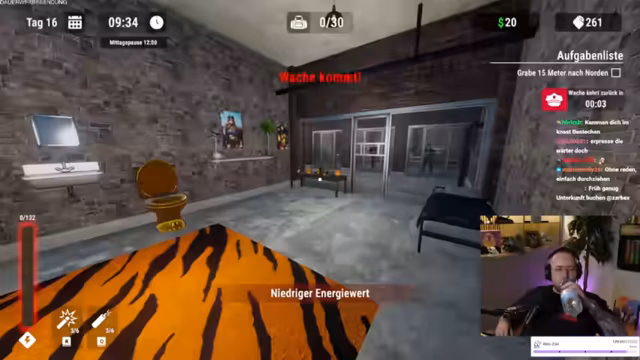06:32:14Der Streamer will seine Zelle abgraden und spart auf die Big Baba Schaufel, um auszubrechen. Er findet Asianudeln super und will sich gleich welche machen. Es gibt noch eine Schaufel, die besser ist, die Super Schaufel, auf die er abfeuern will. Die ist sau teuer, aber er kriegt sie günstiger, weil er seine Zelle so krass geupgradet hat. Er hat das Quest-Item gefunden, die goldene Platte, die er sogar schon mal hatte und an den Wächter verschachert hat. Er will eine Top-Pflanze, um mehr Zeit zu haben, wenn der Wert da kommt. Er kann nicht verraten, woher der Schrank ist, aber es ist eine Wunschanfertigung. Er will einen Schrank mit Fächern, mit Holzpanelen im Hintergrund und geiler Beleuchtung für die Stream Awards etc. Der Schrank ist genauso geworden, wie er ihn haben wollte. Er will noch ein paar Dollar in Knastrabatte investieren, gerade wenn er jetzt so was Teures wie die Schaufel holen will. Er sammelt jetzt noch Klopapierrollen, kauft ein, zwei Upgrades und mit den Upgrades kauft er dann mit Rabatt die Schaufel. Er muss mal ein paar Steine entsorgen, dass er hier graben kann. Er überlegt, sich ein schönes Sofa in die Zelle zu stellen, für ein bisschen Knastrespekt und für den einen oder anderen extra Rabatt. Die Goldplatte liegt unter dem Steinbrock. Er findet es mittlerweile so geil hier in der Zelle, dass er eigentlich gar keinen Bock hat auszubrechen. Er zögert es mit Absicht hinaus, weil er eigentlich gar nicht aus seiner Pimpzelle hier raus will. Ihm geht es besser als im echten Leben.