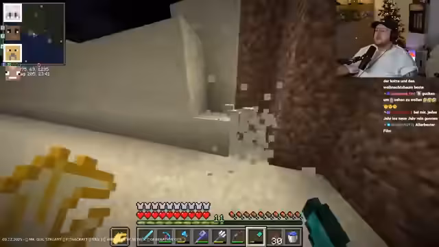 22:57:51Der Streamer unterhält sich mit Chat und den Mitstreitern über den weiteren Plan des Tages. Es geht um das Bauen einer Basis, einen Terraforming-Prozess und das Bauen einer Mauer um den Berg. Der Ton ist entspannt und gesellig, wobei der Streamer seine Freude an dem Gemeinschaftsprojekt und der Vorbereitung für die Nether-Ressourcen-Suche betont. Es werden auch private Absprachen für den nächsten Tag getroffen.