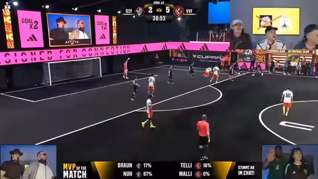 01:39:12Direkt nach dem ersten Spiel beginnt die Partie zwischen Vice Versa FC und G2 Football Club. Der Streamer stellt die Teams vor, die Stars wie Mario Götze (Vice Versa) und das Brüderpaar Hatziavdic (G2) in ihren Reihen haben. Es geht schnell zur Sache, denn nach nur einer Minute steht es 1:1. Der Streamer lobt das hohe Tempo und die technischen Fähigkeiten der Spieler und zeigt sich beeindruckt von der Qualität der Liga.