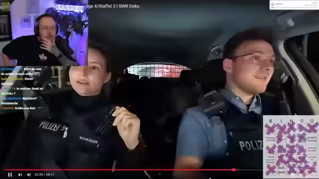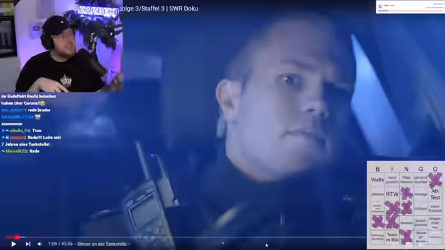 00:33:52Der Stream wechselt zum ersten Content-Block: Bingo mit der Serie Nachtstreife. Der Streamer startet eine Wette mit dem Chat, ob sie mehr als acht Bingo-Felder pro Folge erreichen. Während des Bingos kommentiert er das Geschehen und greift immer wieder persönliche und gesellschaftliche Themen auf. Er verurteilt Gewalt gegenüber Servicekräften in der Gastronomie und am Tanken scharf, da diese oft einen harten Job haben und respektlos behandelt werden. Seine eigene Mutter arbeitete früher an einer Tankstelle, weshalb er das Thema sehr nah am Herzen hat.