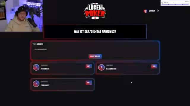 02:21:23In der Quizrunde wird die Frage aufgeworfen, was 'der, die, das Aboli isst', wobei kreative Antworten wie 'Ein Blutgerinnsel in der Herzkammer' oder 'Penisverkrümmung' vorgeschlagen werden. Es wird betont, dass die Antwort möglichst real und smart klingen soll, um die anderen Teilnehmer zu täuschen. Anschließend geht es um den Begriff 'Animalismus', wobei die Teilnehmer zwischen 'religiöser Verehrung von Tieren' und 'sexueller Anziehungskraft gegenüber Tieren' schwanken. Die Diskussion dreht sich um die Kunst, die anderen in die Irre zu führen und Punkte zu sammeln, indem man eine glaubwürdige, aber falsche Antwort gibt. Abschließend wird gefragt, was Sandro Sanchez widerfahren ist, als er mit dem Bus durch Rio de Janeiro fuhr, wobei die Antwort 'Er setzte einen Herrentrend durch seinen außergewöhnlichen Schnurrbart' als humorvolle Möglichkeit in Betracht gezogen wird. Es wird die Bedeutung betont, auf den Chat zu hören und die Reaktionen der anderen Teilnehmer zu berücksichtigen, um die beste Strategie zu entwickeln.
