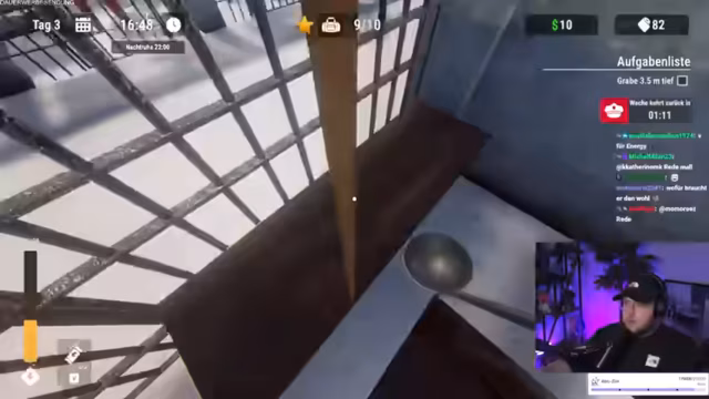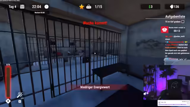 04:42:07Der Stream beginnt mit der Beschäftigung im Knast-Ausbruch-Simulator. Der Fokus liegt auf dem Sammeln von grundlegenden Ressourcen wie Dosen-Ravioli, Münzen und dem Ausgraben von Gegenständen. Der Streamer preist das Spielprinzip als gelungen an, da es ein Gefühl von Progression und Grinding vermittelt. Das Einrichten der Zelle und das Gründen von Tunneln sind zentrale und als geil empfundene Aktivitäten im Anfangsstadium.