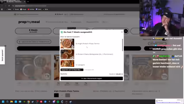 00:48:11In einem Werbesegment wird der Partnerschaft mit PrepMyMeal gedacht, dem der Streamer eine langfristige Zusammenarbeit wünscht. Er demonstriert im Stream seinen Online-Einkauf für die Meal-Boxen, wobei er sich unsicher ist und um Rat gebeten wird. Er legt Pizzatono, Mac and Cheese, Proteinpasta Bolognese und weitere Gerichte in seinen Warenkorb und betont den hohen Proteingehalt und die Bequemlichkeit des Dienstes.