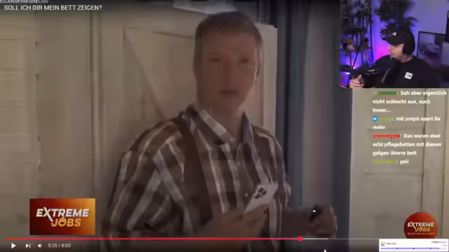 01:01:02In einem humorvollen Abschnitt unterhält sich der Streamer über seine Zukunft und die seines Kumpels Schradin. Er skizziert absurde und groteske Szenarien, darunter den Gedanken, Schradin, der dann 67 Jahre alt wäre, vielleicht im Seniorenheim pflegen und sogar den Arsch abwischen zu müssen. Er zitiert fiktive Anrufe aus einem Altenheim und stellt sich die "Sex-Ikone Stegi" vor, was ihn zu der provokanten Frage führt, ob er jemals solche Tätigkeiten für einen anderen Menschen übernehmen würde. Der ganze Abschnitt dient als Running Gag über den altersbedingten Verfall.