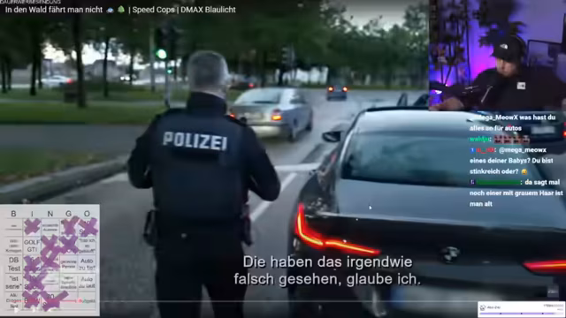 02:21:45Die fiktiven Polizisten kontrollieren einen stark getunten Golf GTI. Der Fahrer kooperiert und gibt an, Umbauten vorgenommen zu haben, für die er die Teilegutachten besitzt. Der Streamer und die Community diskutieren in Echtzeit, was als Tuning gilt und welche rechtlichen Anforderungen bestehen. Der Streamer zeigt Respekt für eine gelungene Tuning-Szene, äußert aber Kritik an billigen und unsachgemäßen Umbauten. In diesem Fall wird dem Fahrer aufgrund seiner Kooperationsbereitschaft Gnade walten gelassen und er wird aufgefordert, die nicht eingetragene Folie an den Rückleuchten selbst zu entfernen, um eine Mängelbeseitigung vor Ort zu demonstrieren.