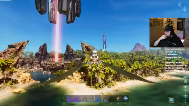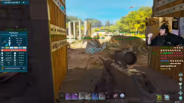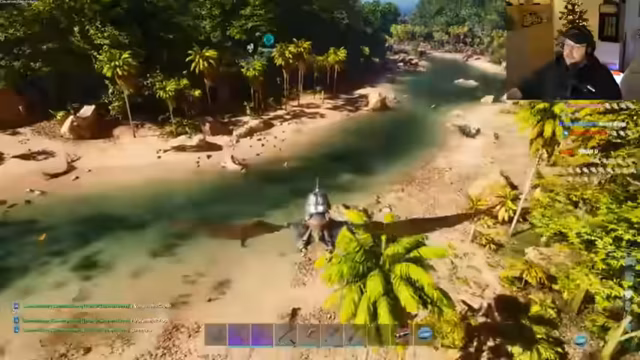02:49:28Der Streamer fliegt mit seinem Vogelmann und erkundet die Map, während er über das Rollenspiel (RP) und die Möglichkeit eines Servers mit über 100 Spielern spricht. Die Suche nach einem Megatherium (Faultier-Dino) wird erklärt: Es ist nützlich für Bosskämpfe, da es gegen Insekten einen Stärkungs-Buff erhält. Es werden Strategien zum Zähmen mit Betäubungspfeilen und Futter (Honig, Beeren) diskutiert. Gleichzeitig werden unnötige Items aussortiert, um Inventarplatz zu sparen.