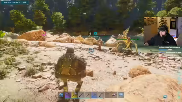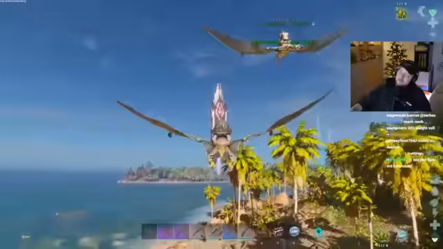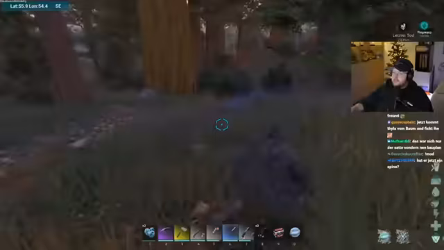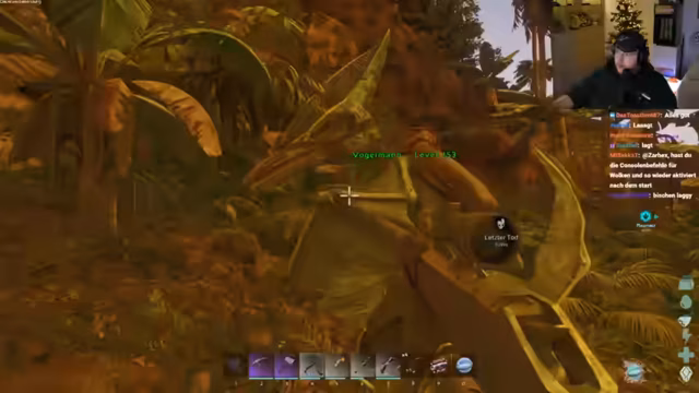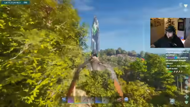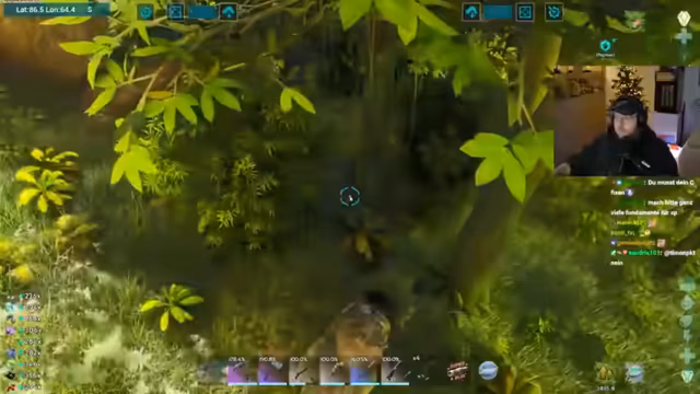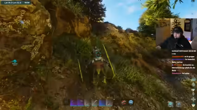 05:55:29Die Session beginnt mit dem Erkunden der ARK-Karte, bei der die Ecke um Spinos und Brontosaurier abgesucht wird. Dabei werden auch Plattformsattel für Langhalsdinosaurier wie Brontosaurus besprochen, die als Basis für fliegende Festungen genutzt werden können, und der gesuchte Quetzal als riesiger Flugsaurier erwähnt. Die Jäger finden mehrere Spawn-Punkte leer vor und beschließen, zum Ausdauerregenerieren zu landen. Im Sumpfgebiet wird nach Fröschen gesucht, wobei beschrieben wird, wie man Dinos anlecken und betäuben kann, während Krokodile und Schlangen die Herausforderung erhöhen. Der Chat gibt Tipps zum Zähmen von Tieren, was als einer der geilsten Aspekte des Spiels bezeichnet wird.