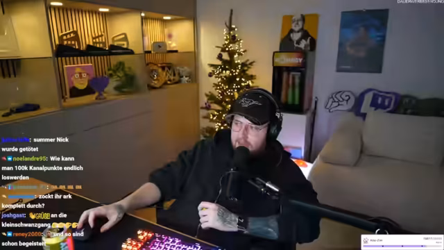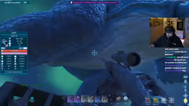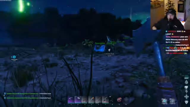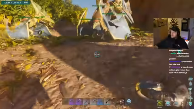02:20:41Ein Gespräch über Fortschritt in ARK: Es stellt sich heraus, dass Eli bereits einen T-Rex („Melina“) in Redwood gezähmt hat, entgegen ursprünglicher Pläne für langsameren Fortschritt. Der Streamer plant Airdrops zu farmen und erklärt die Seltenheitsstufen (von weiß bis rot). Während der Gameplay-Phase treten technische Probleme auf: Grafik-Bugs (Schatten), die durch Wechsel zu Englisch im Spiel gelöst werden, sowie Lags und FPS-Einbrüche, die zu Diskussionen über Einstellungen (DLSS vs. DLAA, Auflösung) führen.