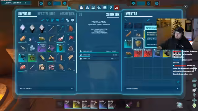 04:16:21Die Spieler managen ihre Dinos, indem sie sie in Kisten und Schränke packen, um die Performance zu verbessern und die Übersicht zu behalten. Sie sammeln Materialien für Boss-Kämpfe und Artefakte aus Höhlen, craften Sättel und Rüstungen. Eine Babyfabrik wird erwähnt, um Dinos zu züchten und Mutationen zu erreichen. Entscheidungen werden getroffen, welche Dinos für die Höhle mitgenommen werden, und es gibt Interaktionen über Angebote und Deals.
