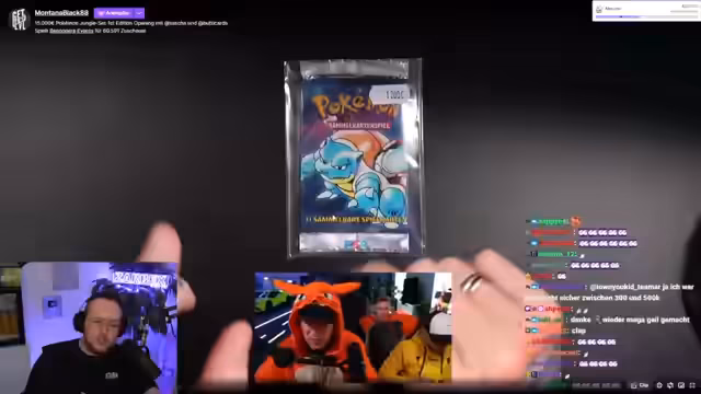 04:08:37Der Streamer sucht nach Informationen über das Jungle First Edition Set, um zu sehen, welche Karten man ziehen kann. Er erwähnt, dass die Packs für 57 Euro von den Dudes verkauft wurden und dass der Käufer die Möglichkeit hat, das Ganze aus Ziel zu lassen, wenn es sich um ein leichtes Pack handelt. Er zählt einige der geilen Karten auf, die man ziehen kann, wie Knuddelhof, Pantymos, Pipi, Pixi und Relaxo. Er hofft auf das Relaxo, aber jede Holo wäre geil. Er würde sich am meisten über eine Evoli-Entwicklung freuen. Er erwähnt, dass Sascha aka unsympathisch.tv als Unterstützung im Blurak-Outfit dabei ist, sowie Buddy, der Pokémon-Experte. Er hat zwei Packs für 400 Euro gekauft und schlägt vor, dass die Packs verteilt geöffnet werden, um die Spannung zu erhöhen. Er freut sich auf den Sonntag und bedankt sich bei den Zuschauern für die Unterstützung.