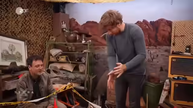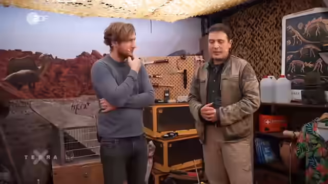 01:51:46Die Protagonisten verkosten Studio-Brot und Schmelzkäse, während sie die Terra X Dino-Expedition ansehen. Nizar betont, wie wichtig es ist, den Schmerz, den die Umgebungstemperatur von 48 Grad verursacht, zu berücksichtigen, auch wenn man ihn durch den Monitor nicht spürt. Eine interessante Y-förmige Struktur im Oberkiefer wird diskutiert, während Nizar den Schmelzkäse probiert. Es wird spekuliert, dass der Spinosaurus kleine Dinosaurier, Krokodile und Amphibien jagte. Anatomische Untersuchungen zeigen, dass der Alankwa seine Beute ausspähte, was die Beschreibung von Forns verdeutlicht. Die Szene wird als Horrorfilm-mäßig mit Suspense beschrieben, wobei der schlanke Jäger Tarnung nutzt. Ein Jungtier verschwindet spurlos, und Sue Beck muss den Rest der Familie aus dem Wald des geflügelten Jägers führen. Die Frage wird aufgeworfen, wer schlimmer ist, der Flugsaurier oder der Karcharodontosaurus, wobei der Flugsaurier im Wald als bedrohlicher angesehen wird. Ein Verwandter des Flugsauriers mit riesiger Flügelspannweite und langem Kiefer wird erwähnt, der auf dem Boden so hoch wie eine Giraffe war. Das Team spricht über die Menge an Spinosauriern und erklärt, wie sie auf so engem Raum miteinander auskommen konnten. Nisa Ibrahim und sein Kollege Gabriele Binderlini haben erste Hinweise gefunden.