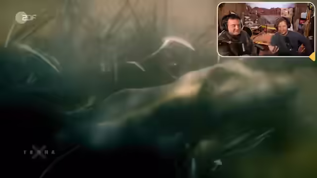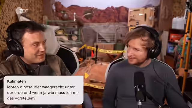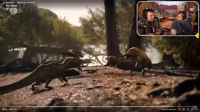 00:40:41Maxim und Nizar stellen ihre Top-5-Liste fertig: Spinosaurus auf Platz 1, T-Rex auf Platz 2, Deinonychus auf Platz 3, ein gepanzerter Dinosaurier und Triceratops. Die Zuschauer können weiterhin ihre Lieblingsdinos in den Chat schreiben. Die Redaktion hat auch eine Liste vorbereitet. Yoshi und Godzilla werden erwähnt, aber es soll sich auf echte Dinos konzentriert werden. Velociraptor und Ankylosaurus sind ebenfalls beliebt. Nizar erklärt, dass einige gepanzerte Dinosaurier ihre Panzerung für Rangkämpfe nutzten. Littlefoot ist auch sehr beliebt im Chat. Nizar erklärt, dass der Brontosaurus tatsächlich wieder ein gültiger Dinosauriername ist. Der Giraffatitan im Berliner Museum ist das höchste aufgestellte Dinosaurierskelett der Welt. Es wird kurz diskutiert, ob der Giraffatitan seinen Hals wirklich so aufrecht halten konnte. Dinosaurierskelette werden immer wieder neu aufgebaut, da die Wissenschaft sich weiterentwickelt. Es folgt ein Übergang zur Terra-X-Folge, die auf dem ZDF-Streaming-Portal verfügbar ist. Die Zuschauer können ein Bingo spielen, während sie die Folge ansehen. Nizar hat die Folge noch nicht komplett gesehen und lässt sich überraschen.
