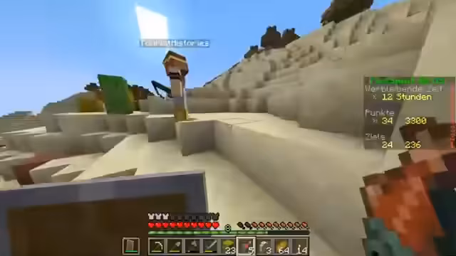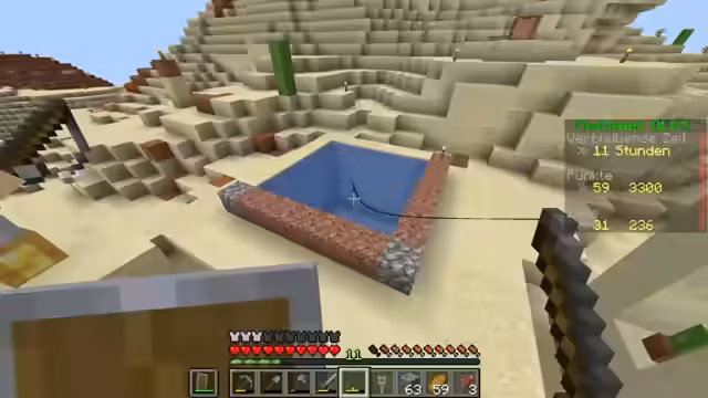 00:11:26Nach dem erfolgreichen Start in Minecraft spawnen die Spieler in einer Wüste. Zunächst wird grundlegende Ausrüstung wie Werkzeuge aus Holz hergestellt. Das Hauptziel ist, zuerst Essen zu beschaffen, da die Spieler sonst verhungern könnten. Dazu werden Fische im Wasser gefangen und gebraten. Gleichzeitig wird nach Ressourcen wie Stein und Eisen gesucht, um bessere Werkzeuge und Rüstung herstellen zu können. Die Nacht stellt eine gefährliche Zeit dar, da Monster spawnen können, weshalb geplant ist, ein sicheres Haus zu bauen.
