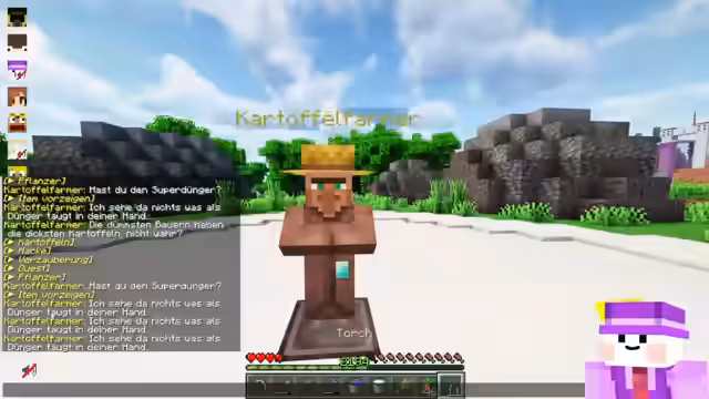 04:06:47Es wird überlegt, ob es sich lohnt, weiter in der Mine zu farmen oder zurückzugehen und Level zu holen. Die Upgrade-Station wird aber trotzdem benötigt. In der Mine gibt es eine Einlasskontrolle, die die Mining-Geschwindigkeit reguliert. In der Mine gibt es Crafting Tables und Komposter. Es wird erwähnt, dass es Bosse im Spiel gibt und man wahrscheinlich Combat Level benötigt. Ein Spieler gibt den Superdünger ab und erhält dafür eine Quest. Ein anderer Spieler findet eine Levelfrucht, die 500 Level gibt. Ein Crafter kann mit fünf Eisen, einem Spender, zwei Redstone und einer Werkbank gecraftet werden. Ein Spieler erklärt, wie man Erde herstellt: Aus Cobblestone wird Gravel gemacht, das dann mit Dirt zu Coarse Dirt wird, das wieder abgebaut wird. Mit dem Eisen kann man auch ein Eisenschwert machen. Ein Spieler findet einen Menschenkopf in der Welt. Es wird besprochen, dass man das magische Eisen nicht einschmelzen, sondern eintauschen soll, um daraus Rüstung zu machen. Mit einer Full-Eisen-Rüstung hat man nur zwei Rüstungspunkte. Es wird überlegt, ob es so gewollt ist, dass man das Eisen erst traded und dann die Rüstung macht.