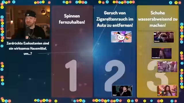 00:36:19Die Quizshow geht weiter mit Fragen zu unterschiedlichen Themengebieten. Nachdem die Frage nach dem wirksamen Hausmittel gegen Spinnen (zerdrückte Esskastanien) keine Punkte bringt, folgt eine Frage zum Bewegungsverhalten der Deutschen. Diese Frage wird von Lost Kitten und Baso richtig beantwortet, was den Standpunkte der Teams verändert. Es entwickelt sich ein spannendes Kopf-an-Kopf-Rennen zwischen den Teams, bei dem das Schubsen auf den virtuellen Feldern für zusätzlichen Chaos sorgt.