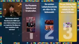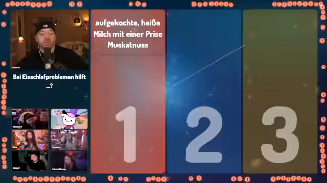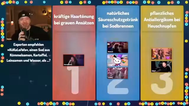 00:03:59Der Stream startet und begrüßt die Zuschauer. Der Streamer erwähnt seinen neuen teuren Fernseher, auf den er sich lange gefreut hat, und plant, ihn mit einem passenden Stand zu platzieren. Der Hauptinhalt des Streams ist das Quiz '1,2 oder 3' von Tim Horus. Das Format, bei dem die Teilnehmer auf Felder mit der richtigen Antwort rennen, ist neu für den Streamer, weshalb er es kurz erklärt und sich auf den bevorstehenden Mitspiel vorbereitet. Die Verbindung zu Tim Horus wird gecheckt und ein interaktiver Rahmen für die Show aufgebaut.