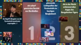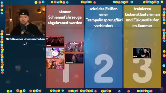 01:46:31Das Spiel 1,2 oder 3 steht im Mittelpunkt, bei dem Teams auf einer virtuellen Bühne um Punkte kämpfen. Zombey überlegt, ob er zu Holly wechseln soll, kommt aber zu dem Schluss, dass dies nicht klug wäre, da er sonst die richtige Antwort nicht geben könnte. Die Runde beginnt, und Zombey, der die Antwort lautet, bleibt auf der Drei, was sich als richtig erweist. Das Spiel wird intensiv gespielt, und die Teams müssen die richtige Antwort wählen, um Punkte zu sammeln.