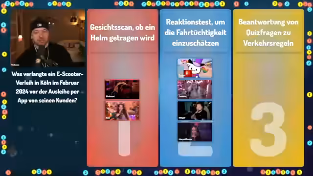 01:53:06Die Quizrunden gehen mit spannenden Fragen weiter, z.B. was ein E-Scooter-Verleih in Köln im Februar 2024 vor der Ausleihe verlangte. Die Teams diskutieren verschiedene Möglichkeiten, wobei eine Annahme ein Reaktionstest ist. Die richtige Antwort ist jedoch, dass ein Sicherheitstest zur Überprüfung des Reaktionsvermögens durchgeführt werden musste. Die Teams schätzen ab, und der Überblick über die Punkteverteilung bleibt spannend.
