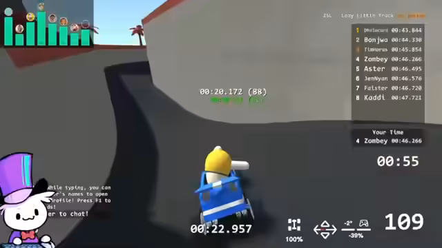 02:01:56Die Teilnehmer eines Zeepkist-Rennens konzentrieren sich auf die Beherrschung der Strecken, wobei das korrekte Anfahren von Checkpoints entscheidend ist, um diese nicht zu überspringen. Einige Fahrer erreichen bemerkenswerte Rundenzeiten wie 46, was von anderen als sehr beeindruckend und nicht im Ansatz erreichbar eingestuft wird, während der Streamer selbst mit Zeiten um 47 kämpft und seine teilweise langsameren Fahrten mit dem Fehlen von Bremseingriffen begründet.