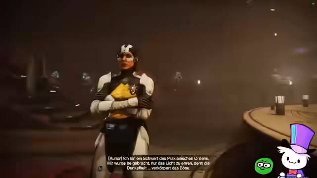 00:29:59Ein entscheidender Moment des Streams ist der Dialog mit dem Mentor Aunor im Praxianischen Tempel. Hier erhält der Streamer als Hüter eine neue Waffe: eine Klinge aus Licht und Dunkelheit. Die darauffolgende Mission erfordert das Abschließen von zwei Herausforderungen auf den Schwierigkeitsgraden 'Mutig' und 'Legendär'. Der Streamer wählt den 'Legendären' Schwierigkeitsgrad, was die Komplexität der bevorstehenden Herausforderung erhöht.