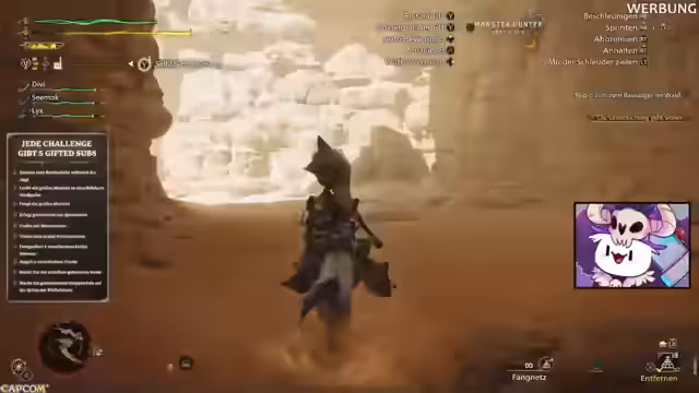 00:03:36Der Stream mit dem Titel 'MONSTER HUNTER WILDS - Coop Jagen und Challenges' beginnt. Zunächst wird der Streamer noch mit technischen Einstellungen beschäftigt, da ein Sponsor-Panel-Overlay importiert werden muss. Es werden Challenges angekündigt, für die jedes erfolgreiche Teamziel zur Verlosung von fünf Abos führt. Der Streamer betont, dass der Stream von Capcom gesponsert wird und er bereits viel Spielzeit in dem neuen Titel investiert hat.