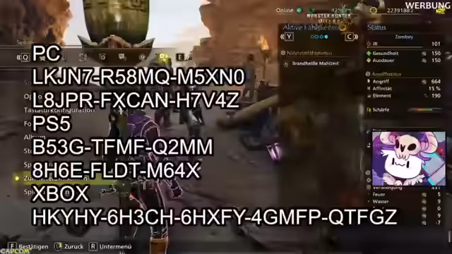02:16:59Zum Ausgleich für die technische Hilfe und die Teilnahme an den Challenges verlost der Streamer Codes für das Spiel 'Monster Hunter Wilds' für verschiedene Plattformen. Es herrscht eine aufgeregte Atmosphäre im Chat, da die Codes sehr schnell eingelöst werden. Die Verlosung wird als Dank an die Community für die gemeinsame Kooperation und das Engagement präsentiert.