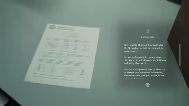 04:51:04Eine Krankengeschichte enthüllt, dass die Testperson 171, ein blindes und emotionsloses Mädchen, beobachtet wird. Der Sicherheitsleiter stellt ihr Fragen über Blut, was als seltsam angesehen wird. Die Aufzeichnungen beschreiben zunehmende Fälle, in denen infizierte Leichten eine schnelle Geweberegeneration und plötzliches gewalttätiges Verhalten zeigen, als 'Crimson-Verwandlung' bezeichnet. Eine Doppelmutation des Virus führt zur Bildung von Tumoren, die bei Zerschießen hochkontagiös sind. Das Hämolytische Gift wird als wirksam gegen diese Mutationen identifiziert.