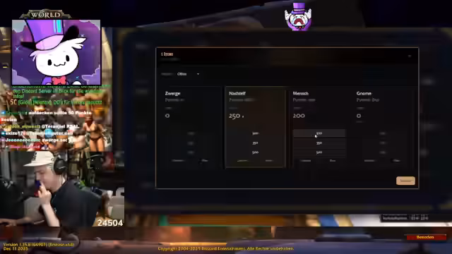 05:03:50Der Stream startet mit der Organisation eines großen Quiz-Events, an dem mehrere Völker aus World of Warcraft teilnehmen. Das Event läuft in Runden, wobei die Teilnehmer in Gruppen wie Menschen, Gnome, Nachtelfen und Zwerge aufgeteilt sind. Ein Moderator leitet das Quiz, stellt Fragen in verschiedenen Kategorien wie WoW, Biologie, Geschichte und Social Media, und vergibt Punkte für richtige Antworten. Das Quiz erfordert Konzentration, da die Teilnahme per Voice-Call und über einen externen Stream erfolgt. Die Streamer und Teilnehmer tauschen sich dabei über die Regeln und den Ablauf aus und bereiten sich auf den ersten Fragenblock vor.