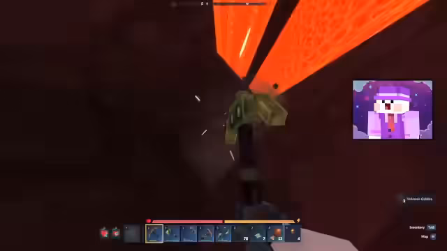 08:00:35Bei Nacht begibt sich der Streamer auf die Suche nach rotem Erz, findet jedoch nur schwarze Umgebung ohne Sicht. Er erkundet Vulkane und entdeckt eine verborgene Kiste mit Goldblöcken in einer Höhle, die als Schatzort markiert war. Während der Erkundung diskutiert er die Weltgenerierung, die sich durch Updates ändern wird, und betont, dass die Progression ähnlich wie bei Terraria oder Salt and Sanctuary ist – linearer als Minecraft, aber mit mehr Richtungen und Biomen.