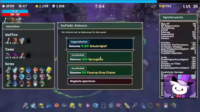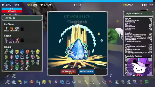 00:38:36Es wurden verschiedene Strategien und Entscheidungen während des Runs diskutiert. Die Wahl zwischen Schimmelhandschuhen und Edelstein wurde im Chat diskutiert, wobei die Entscheidung letztendlich auf die Handschuhe fiel. Es wurde versucht, die Schwierigkeit zu erhöhen und Power-Ups zu sammeln. Es gab auch Momente, in denen versehentlich Sachen mit der Leertaste ausgewählt wurden. Der Fokus lag darauf, Schaden zu erhöhen und Abpraller zu nutzen. Es wurde festgestellt, dass Elite-Gegner Kisten droppen können, was wahrscheinlich vom Glück abhängt. Es wurde auch erwähnt, dass es schwierig ist, alle Schreine in allen drei Leveln zu aktivieren. Trotz einiger Herausforderungen und Schwierigkeiten wurde der Run fortgesetzt, wobei versucht wurde, das Beste aus den gegebenen Situationen zu machen. Gegen Ende des Runs wurde ein Amboss gefunden, der als sehr nützlich erachtet wurde. Es wurde auch festgestellt, dass es keinen Endboss am Portal gibt und man einfach durchgehen kann, wenn man sich bereit fühlt.