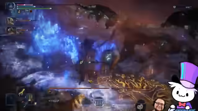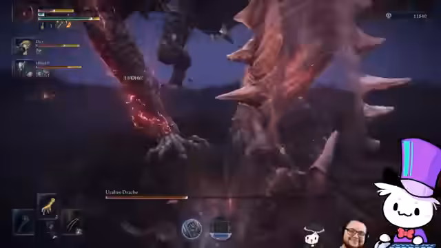 11:08:12Die Streamer treffen auf den Haupt-Boss Manus, der als extrem schwierig beschrieben wird. Sie verlieren einige Male gegen diesen Gegner, finden aber immer wieder neue Strategien. Sie verbessern ihre Ausrüstung weiter mit Items wie einer großen Sternenwaffe mit Blitzverzauberung. Der Kampf ist intensiv und erfordert präzises Ausweichen und Timing.