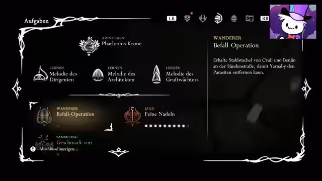 03:12:47Während der Erkundung stößt der Streamer auf einen NPC, der von einem Parasiten befallen ist. Diese Parasiten-Quest nimmt eine zentrale Rolle ein, da der Streamer nicht heilen kann und seine Quests vorerst auf Eis liegen muss. Auf der Suche nach Hilfe erhält er den Hinweis, zur verbannten Ärztin Janami ins Graumoor zu reisen. Dort erfährt er, dass er für die OP Stahlstacheln beschaffen muss, die von den Käfern Benjen und Kröhl in den Käfigen oberhalb der Moche gehandelt werden. Dies führt ihn in eine neue gefährliche Region, die er mit Hilfe eines neuen Moveset meistern muss.