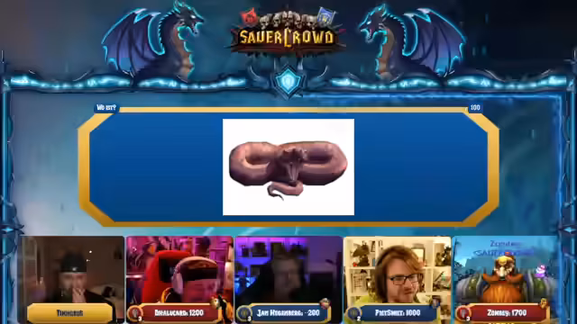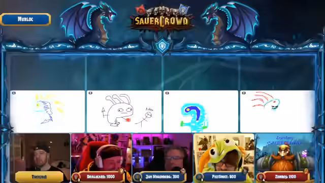 01:12:23Zombey zeigt Zeichnungen von Thunder Fury und Donnerzorn und befragt den Chat nach Meinungen zu den Darstellungen. Die Chat-Bewertungen variieren je nach Community (z.B. Dalu's Chat bevorzugt B, Pete Smith's Chat C), und nach der Abstimmung gewinnt Zombey mit 47% für Option A. Dieser Abschnitt markiert den Übergang vom Malen zum Quiz mit Bonuspunkten für die Gewinner.