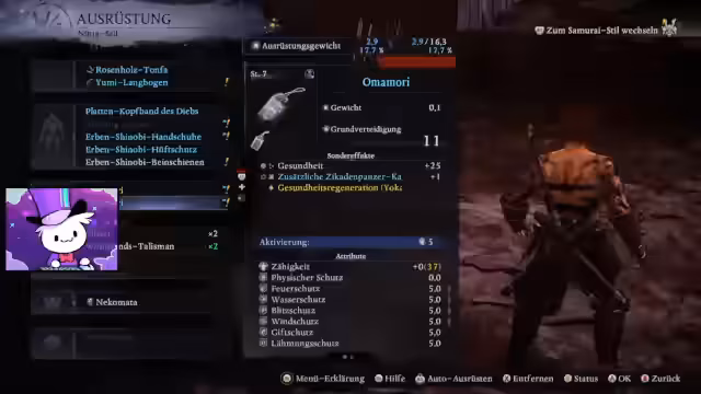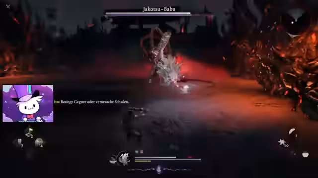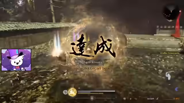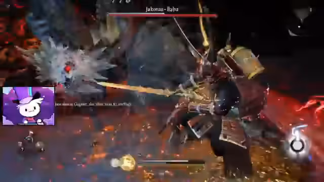 00:27:39Nach einigen Kämpfen mit normalen Gegnern stellt der Streamer den ersten Boss, Mizuki, einen Pferdedämon, in den Schatten. Nach mehreren Anlägen, bei denen er seine Kampftechnik erprobt, schafft er es, den Boss zu besiegen. Die Belohnung hierfür sind seltene Gegenstände und Amrita. Der Sieg erfordert viel Ausdauer und den cleveren Einsatz der Ninja-Transformation und des Parrys.