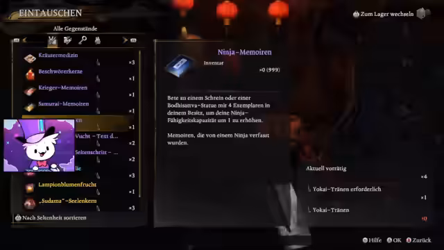 03:54:11Die Erkundung führt zu weiteren Bosskämpfen und herausfordernden Gegnern. Nach einem Sieg über einen 'Biber' wird ein Kampf gegen einen 'Haru' ausgelöst, ein riesiges Monster, das einst ein Kind war. Zusätzlich werden Gegner wie 'Meso-Jäger' und 'Kappa' im Detail bekämpft. Jeder Kampf wird als eine Gelegenheit gesehen, neue Fähigkeiten zu erproben und Loot zu farmen, wie beispielsweise Yokai-Tränen und Ninja-Ausrüstung.