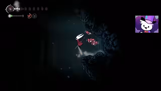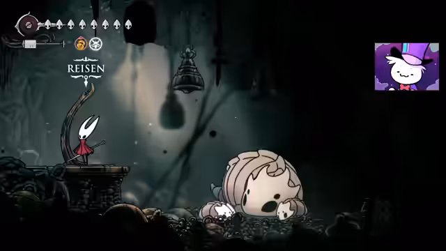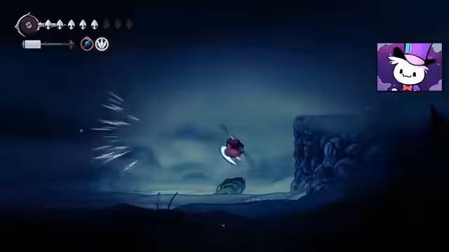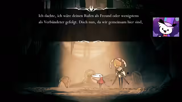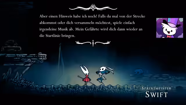 02:47:19Nach mehreren Versuchen wird der NPC Swift besiegt. Dies führt zu einer besonderen Interaktion, bei der der Streamer eine außergewöhnliche Fertigkeit bewiesen hat und eine Belohnung erhält: ein Maskenstück. Der NPC gibt ihm auch ein Splitter-Abzeichen aus dem ersten Spiel Hollow Knight und eine inspirierende Botschaft über das Überwinden des Schicksals und die Kraft der Bewegung.