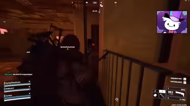 01:24:48Ein toter Spieler wird gefunden, der wahrscheinlich von einem Teammitglied getötet wurde. Die Spieler versuchen, sich zu heilen und planen ihre nächsten Schritte, da sie von einem ganzen gegnerischen Team auf dem Dach umzingelt sind. Es wird beschlossen, sich tiefer in das Gebäude zurückzuziehen, um einen Kampf zu vermeiden, da die Ausrüstung nicht optimal ist. Ein Spieler legt eine Feuerfalle, um die Gegner abzuhalten. Es wird eine Strategie entwickelt, um die Gegner zu überraschen, indem die Tür geschlossen und dann unerwartet wieder geöffnet wird. Der Plan geht auf: Ein Gegner wird sofort ausgeschaltet, und die anderen werden im Raum besiegt. Der Kampf ist erfolgreich, und die Spieler erbeuten wertvolle Gegenstände, darunter eine lila Marke und eine Ferro 4. Die Spieler sind erfreut über den 'geilen Backslam' und die erfolgreiche Tür-Strategie. Es wird nach weiterer Heilung gesucht, da der Kampf intensiv war. Die Möglichkeit, mit Hedge (einer Fluchtmöglichkeit) zu entkommen, wird in Betracht gezogen, da die Spieler überladen sind.