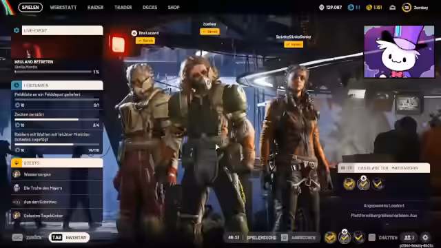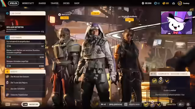 00:08:03Die Gruppe überlegt, welche Mission sie als Nächstes angehen soll. Zombey schlägt vor, den Raumhafen für Freeloadout zu besuchen, um Sonden zu looten und Kerne zu sammeln, da sein Inventar voll ist. Er muss sein Inventar leeren, entweder durch Verkaufen oder durch häufiges Verlieren in Matches. Es wird erwähnt, dass die Lautstärke des Atems im Spiel im Patch geändert wurde, ironischerweise aber lauter geworden ist. Dalu hat den Bunker schon einmal im PvP gemacht, und es wird eine Erfahrung geteilt, bei der ein freundlich scheinendes Team später das eigene Team erschoss. Zombey äußert den Wunsch nach einem Overhaul der Cosmetics, um Helme und Rüstungen besser kombinieren zu können. Die Gruppe entscheidet sich, den Raumhafen zu besuchen, um ihr Inventar zu leeren und Materialien zu sammeln.