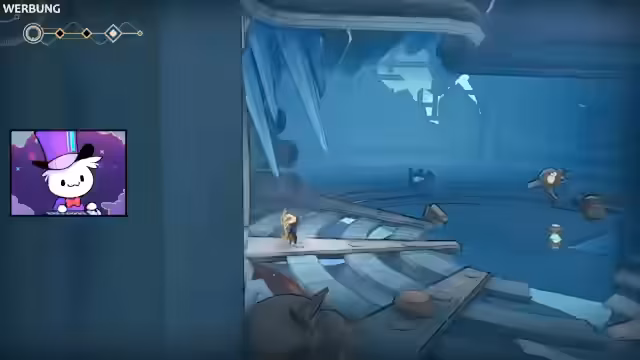 00:17:10Nach technischen Vorbereitungen wird das Spiel gestartet und der Streamer navigiert durch die Menüs, um die Steuerung und Einstellungen wie die deutsche Sprache anzupassen. Die Spielwelt präsentiert sich im stilvollen, düsteren Look eines abgestürzten Raumschiffs. Der Spielercharakter Mio interagiert mit einem anfangs schwachen, schlafenden Roboter namens Rückgrat, der ihr im weiteren Verlauf als Verbündeter und Aufzug dient. Die Welt selbst ist voller kaputter Roboter und geheimnisvoller Orte, erkundet durch Plattforming und Klettern.