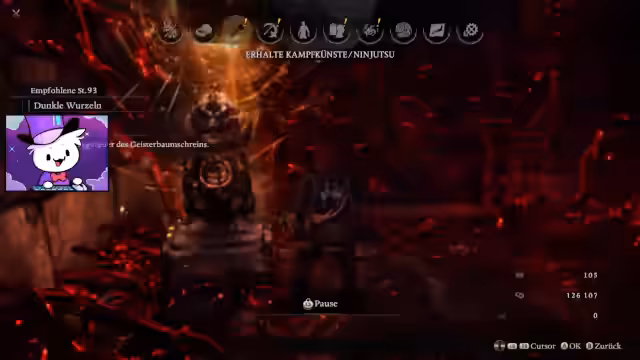03:24:10Während seiner Weiterentwicklung im Fegefeuer erhält der Streamer einen neuen Schutzgeist-Ninja. Dieser bietet ihm Boni wie Höchstgeschwindigkeit, Regeneration durch Treffer und Blitzschaden. Eine wichtige Fähigkeit ist die Regeneration von Leben durch das Sammeln von Amrita, was besonders in Kämpfen nützlich ist. Dadurch ist er weniger abhängig von Heiltränken und kann seine Ausdauer im Kampf besser managen. Er experimentiert mit verschiedenen Konfigurationen, um den maximalen Nutzen aus seinem neuen Schutzgeist zu ziehen.