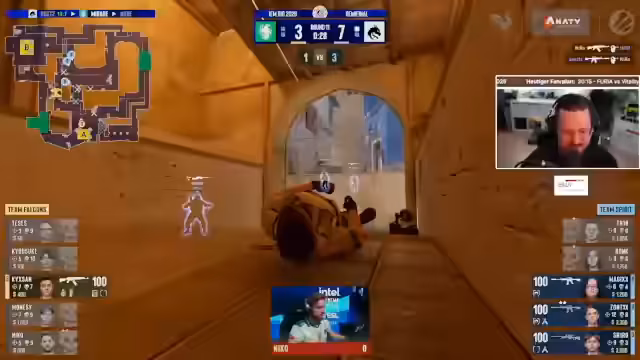 00:45:27Die erste Map beginnt mit einem ausgeglichenen Spielverlauf. Spirit zeigt starke T-Seiten-Performance während Falcons Mühe hat, Runden zu schließen. Monacy hebt sich bei Falcons besonders hervor, während Niko bei Spirit solide, aber nicht herausragend spielt. Falcons verliert beide Pistolrunden und hat Probleme mit der Konvertierung von Runden. Das Spiel ist geprägt von unkoordinierten Aktionen und Fehlern bei den Falcons.